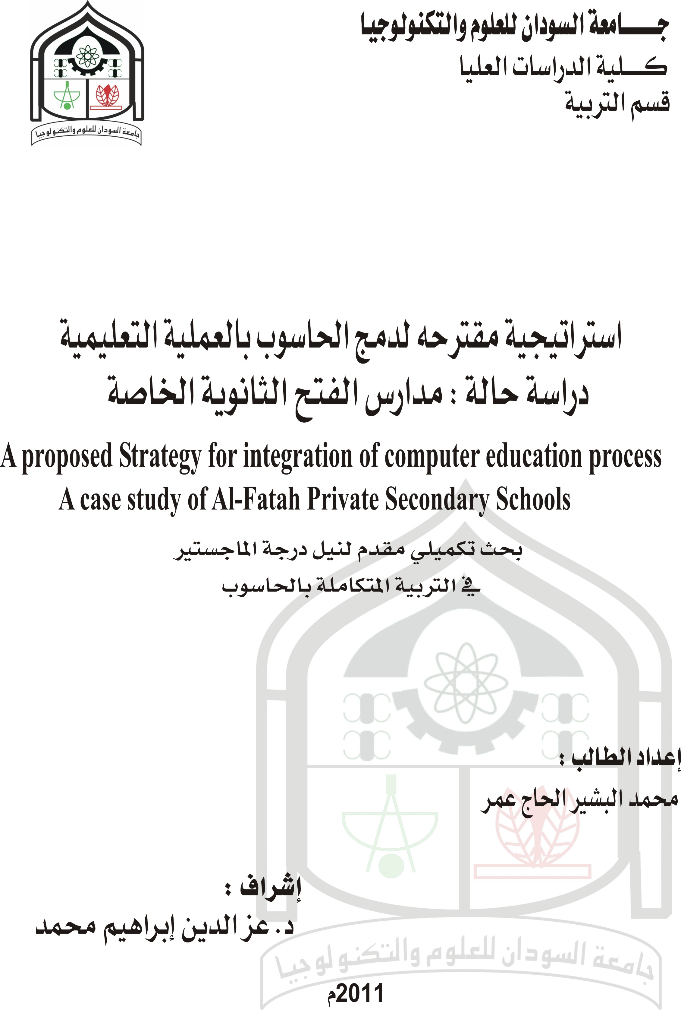 | Citation: | عمر ، محمد البشير الحاج . استراتيجية مقترحه لدمج الحاسوب بالعمليه التعليمية دراسة حالة:مدارس الفتح الثانويه / محمد البشير الحاج عمر ؛ عزالدين ابراهيم محمد ._ الخرطوم :جامعه السودان للعلوم والتكنولوجيا ، التربية ، 2011 ._93ص ؛ 28سم ._ماجستير |