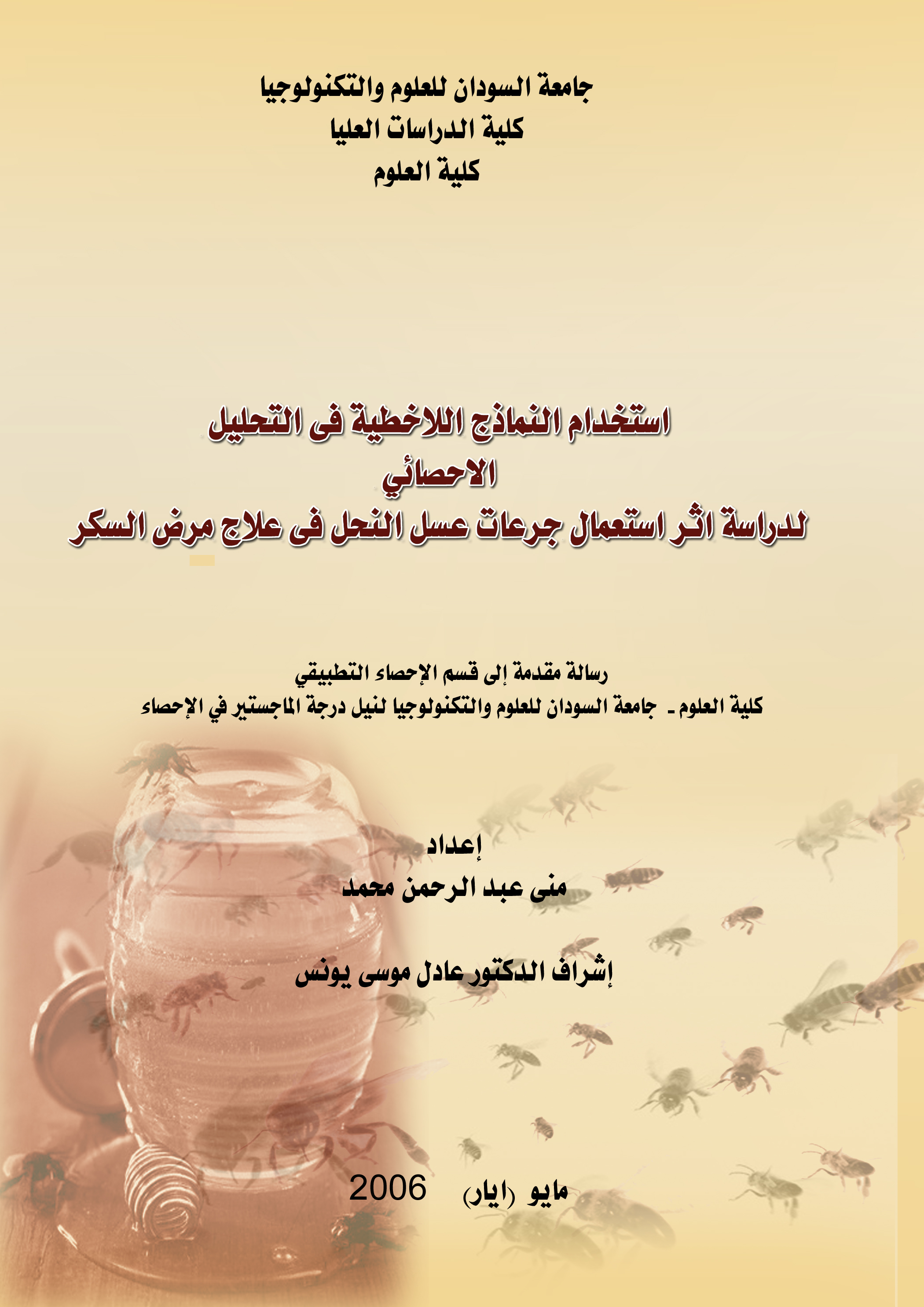 https://repository.sustech.edu/handle/123456789/3511| Title: | استخدام النماذج اللاخطية فى التحليل الاحصائى لدراسة او استعمال جرعات عسل النحل فى علاج مرض السكرى |