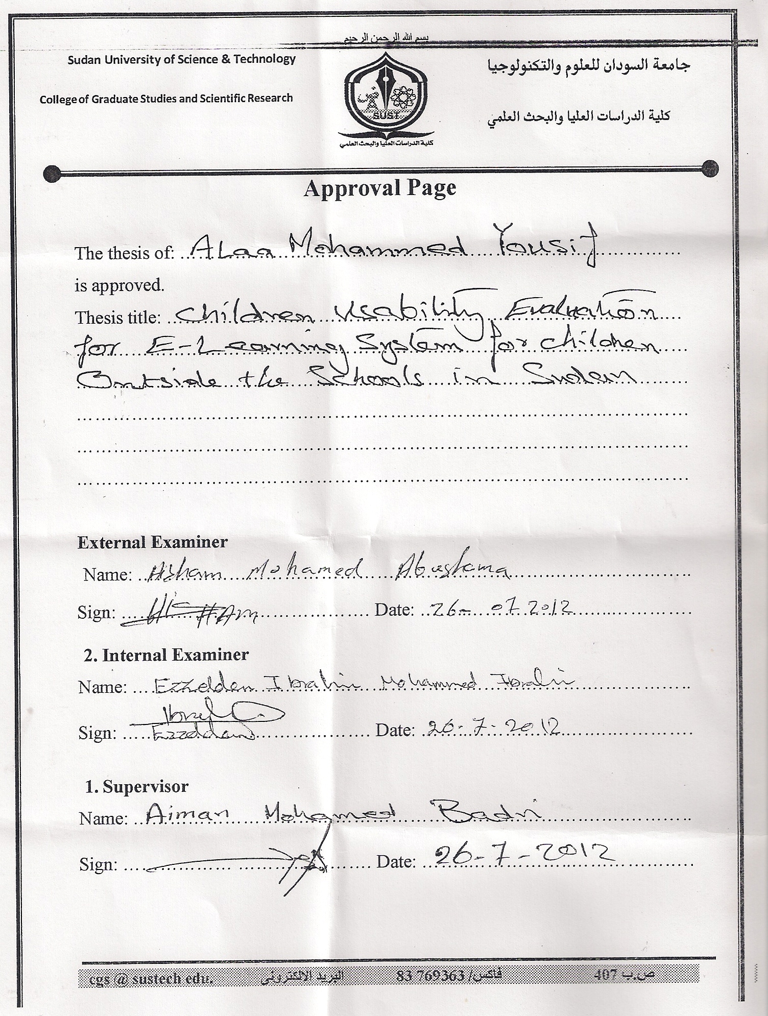 Other Titles: | تقويم قابلية استخدام الأطفال لمشروع التعليم الإلكتروني للأطفال خارج المدارس في السودان |
